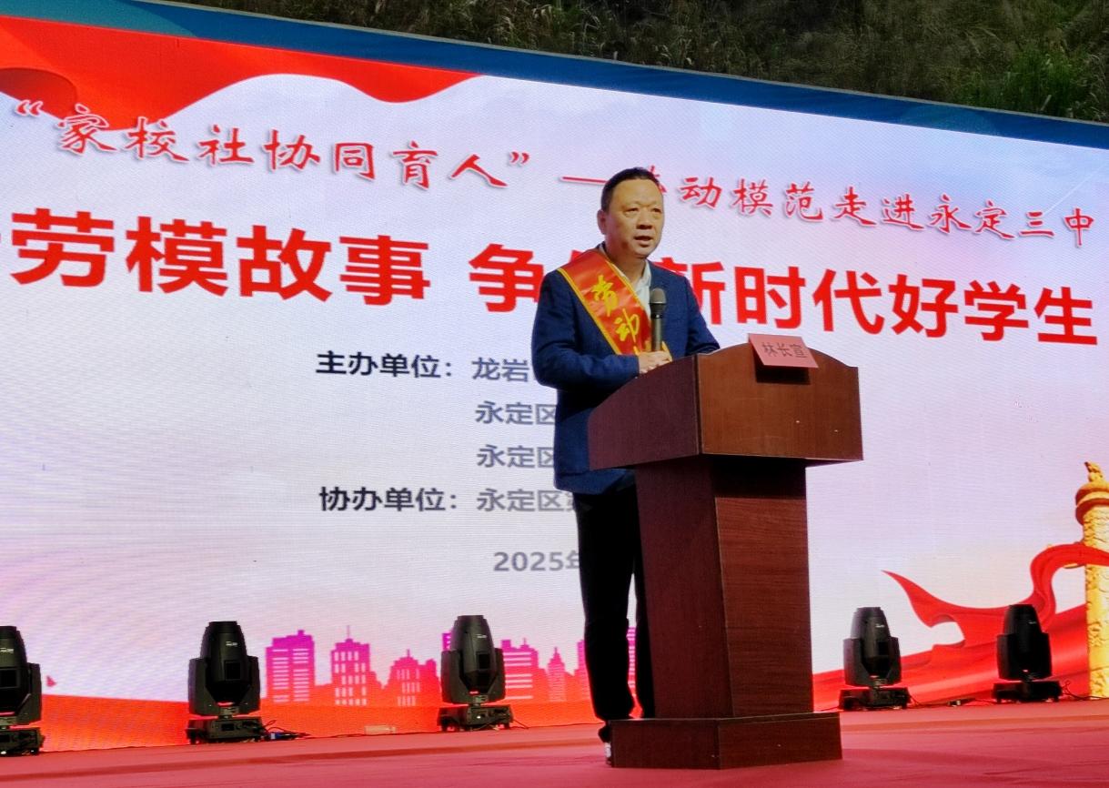 在學校體育場舉辦的“聆聽勞模故事 爭做新時代好學生”活動中,龍巖市勞動模范、區關工委“五老”工作室成員、區勞模工匠兼職輔導員、永定區康明眼鏡驗配中心經理林長宣結合自身創業奮斗經歷和奉獻愛心的故事,引導同學們樹立正確的勞動觀,并在學習、生活中學會感恩。老教師王雄鈞講述了幾十年來教育環境、教學設施的巨大變化,讓同學們感受到國家發展給教育帶來了諸多積極影響。