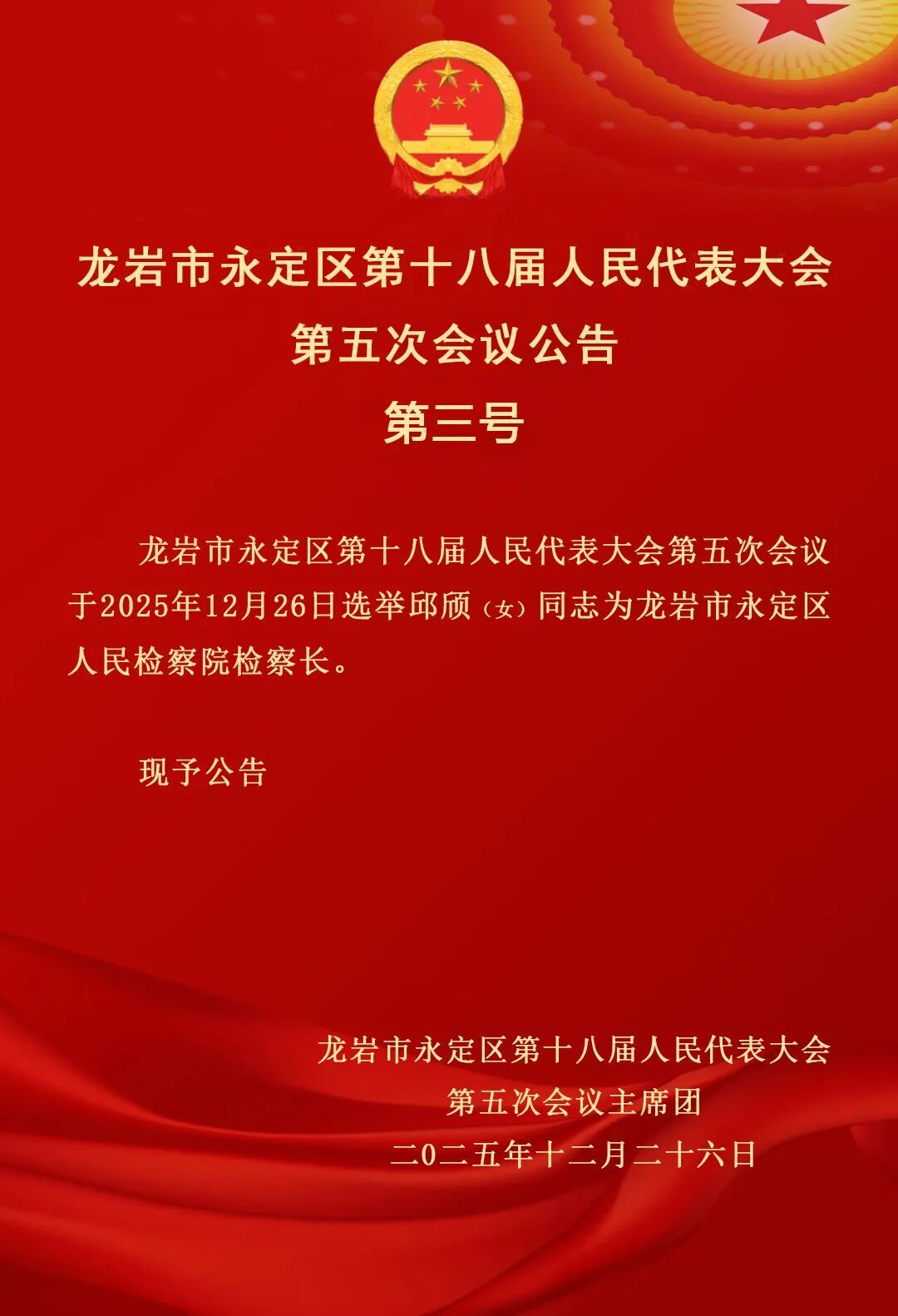 龍巖市永定區第十八屆人民代表大會第五次會議公告(第三號)