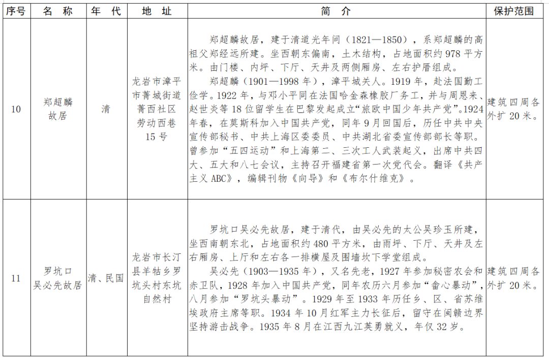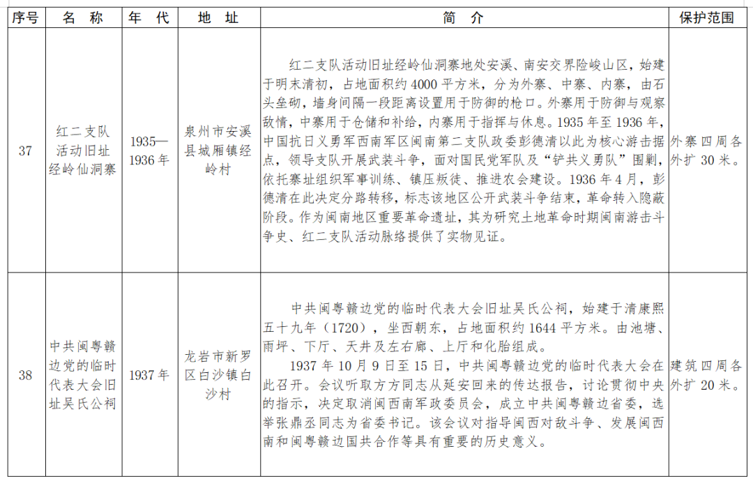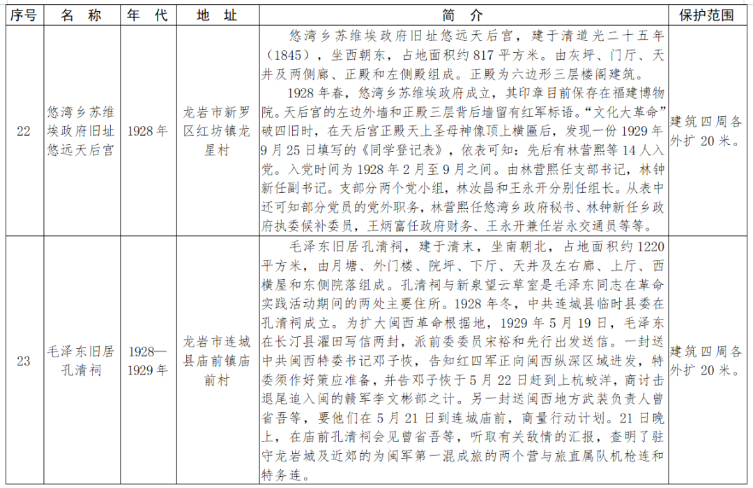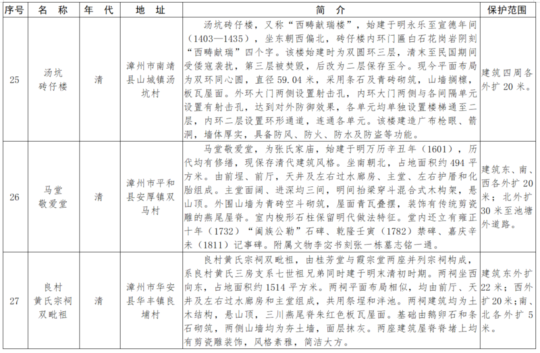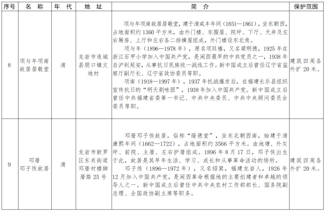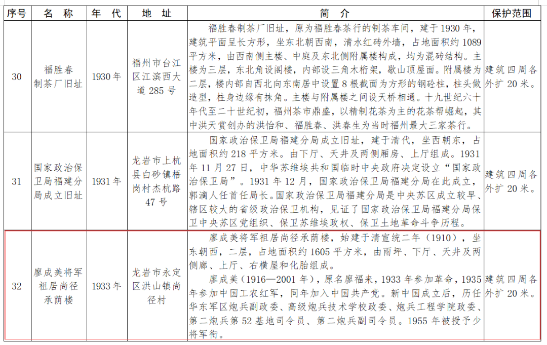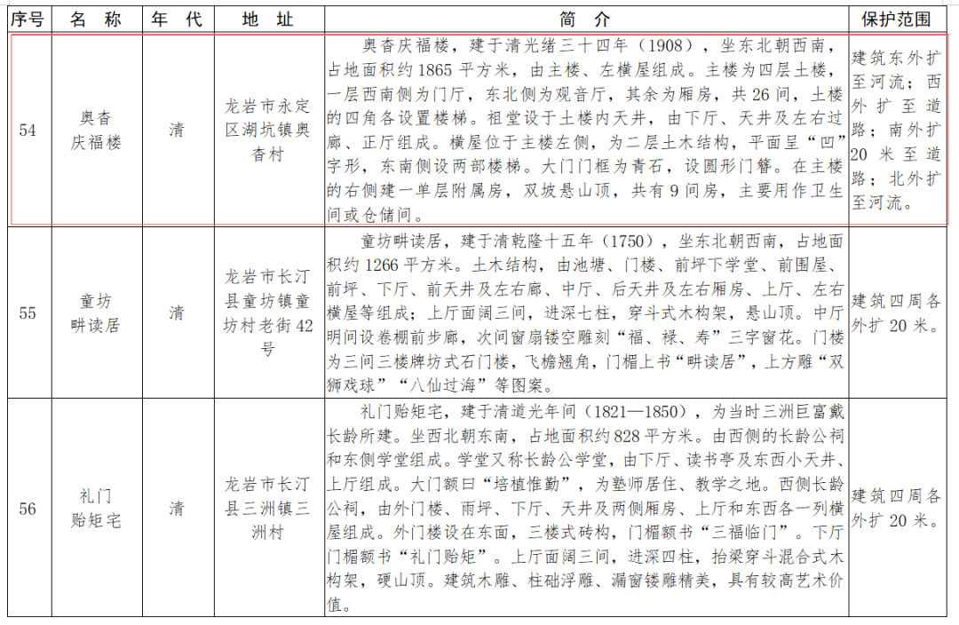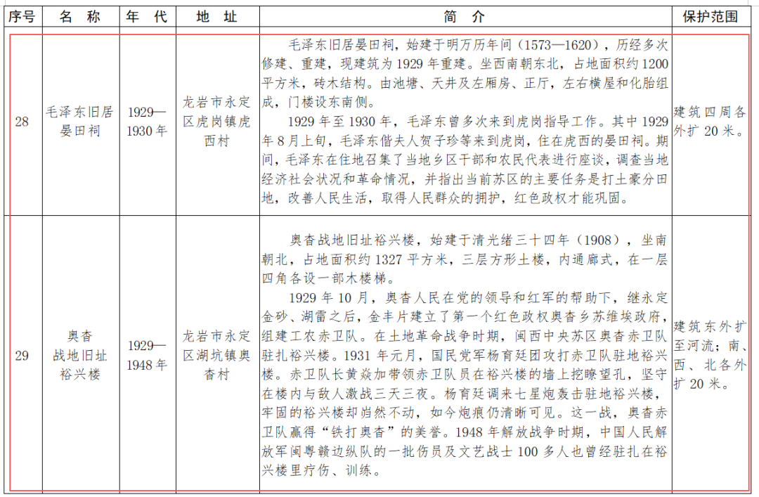 視頻加載中... 近日,福建省人民政府公布了第十一批省級(jí)文物保護(hù)單位名單及保護(hù)范圍,133處(含2處擴(kuò)展項(xiàng)目)榜上有名,其中包括永定區(qū)的5處文物。 據(jù)悉,此次公布的“省保”單位涵蓋古遺址6處、古墓葬8處、古建筑63處、古石刻及造像8處、近代重要史跡及代表性建筑45處、其它1處、擴(kuò)展項(xiàng)目2處。其中,永定區(qū)湖坑鎮(zhèn)奧杳村“慶福樓”被列入古建筑類;永定區(qū)湖坑鎮(zhèn)奧杳村“奧杳鄉(xiāng)蘇維埃政府舊址‘裕德樓’”、永定區(qū)虎崗鎮(zhèn)虎西村“毛澤東舊居‘晏田祠’”、永定區(qū)湖坑鎮(zhèn)奧杳村“奧杳戰(zhàn)地舊址‘裕興樓’”、永定區(qū)洪山鎮(zhèn)尚徑村“廖成美將軍祖居尚徑‘承蔭樓’”等4處被列入近代重要史跡及代表性建筑。 福建省第十一批省級(jí)文物保護(hù)單位名單及保護(hù)范圍 一、古遺址(6處)