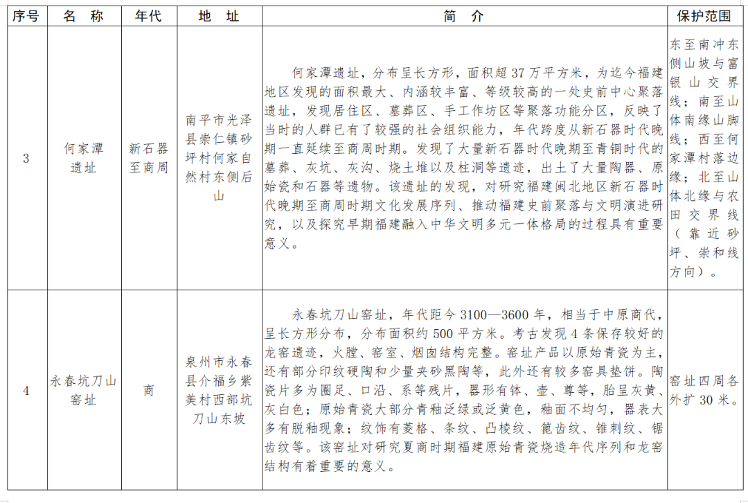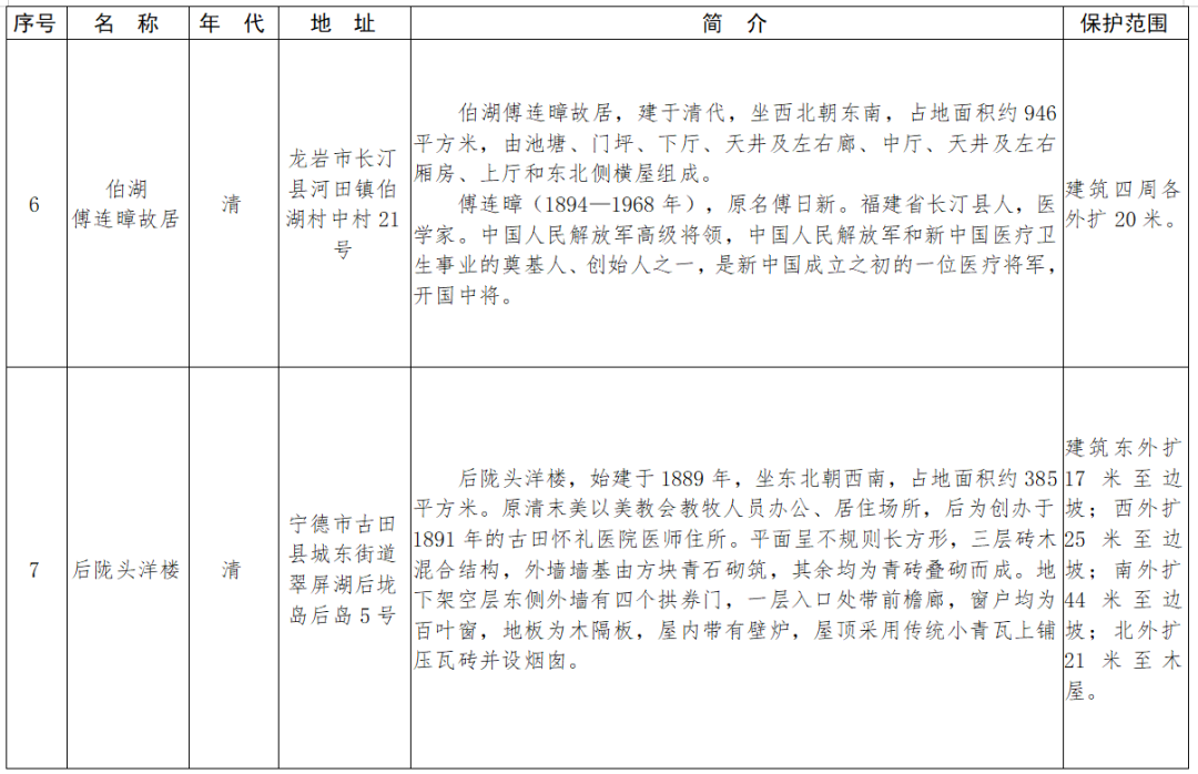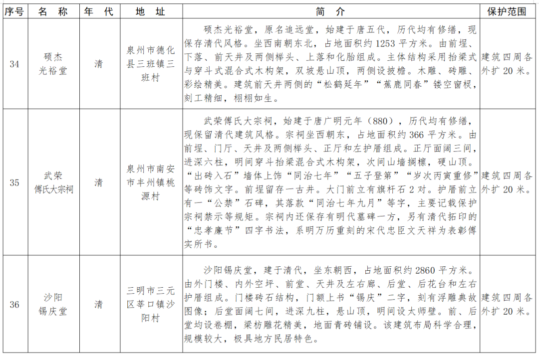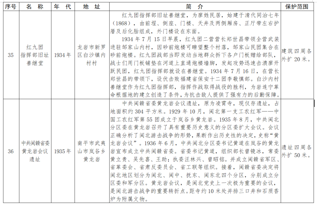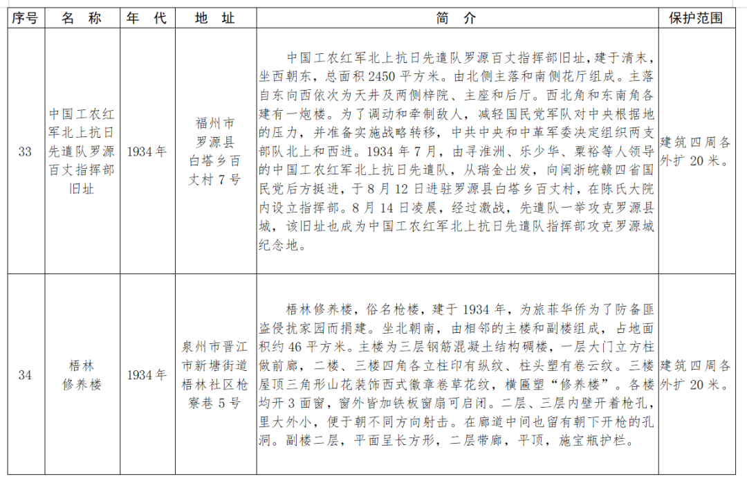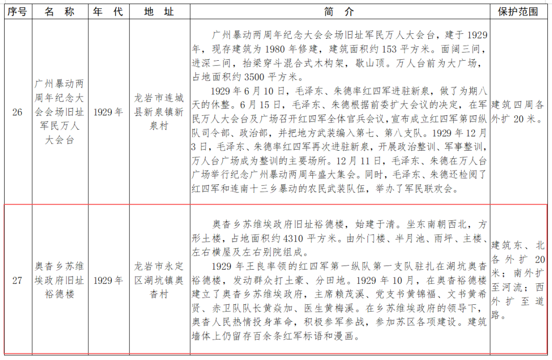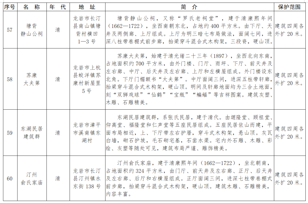 視頻加載中... 近日,福建省人民政府公布了第十一批省級(jí)文物保護(hù)單位名單及保護(hù)范圍,133處(含2處擴(kuò)展項(xiàng)目)榜上有名,其中包括永定區(qū)的5處文物。 據(jù)悉,此次公布的“省保”單位涵蓋古遺址6處、古墓葬8處、古建筑63處、古石刻及造像8處、近代重要史跡及代表性建筑45處、其它1處、擴(kuò)展項(xiàng)目2處。其中,永定區(qū)湖坑鎮(zhèn)奧杳村“慶福樓”被列入古建筑類;永定區(qū)湖坑鎮(zhèn)奧杳村“奧杳鄉(xiāng)蘇維埃政府舊址‘裕德樓’”、永定區(qū)虎崗鎮(zhèn)虎西村“毛澤東舊居‘晏田祠’”、永定區(qū)湖坑鎮(zhèn)奧杳村“奧杳戰(zhàn)地舊址‘裕興樓’”、永定區(qū)洪山鎮(zhèn)尚徑村“廖成美將軍祖居尚徑‘承蔭樓’”等4處被列入近代重要史跡及代表性建筑。 福建省第十一批省級(jí)文物保護(hù)單位名單及保護(hù)范圍 一、古遺址(6處)