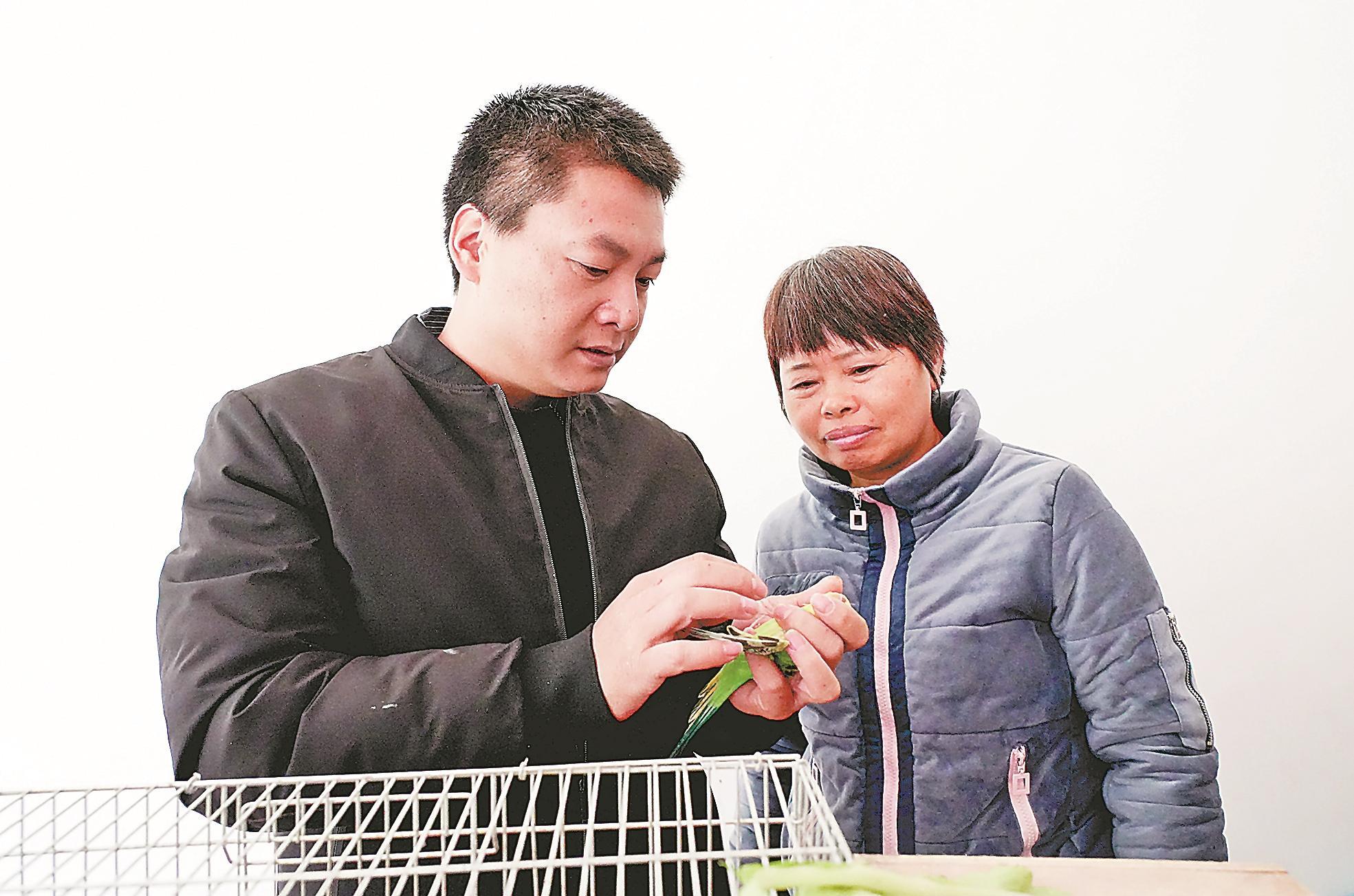 李新源(左)為農戶指導鸚鵡養殖技術