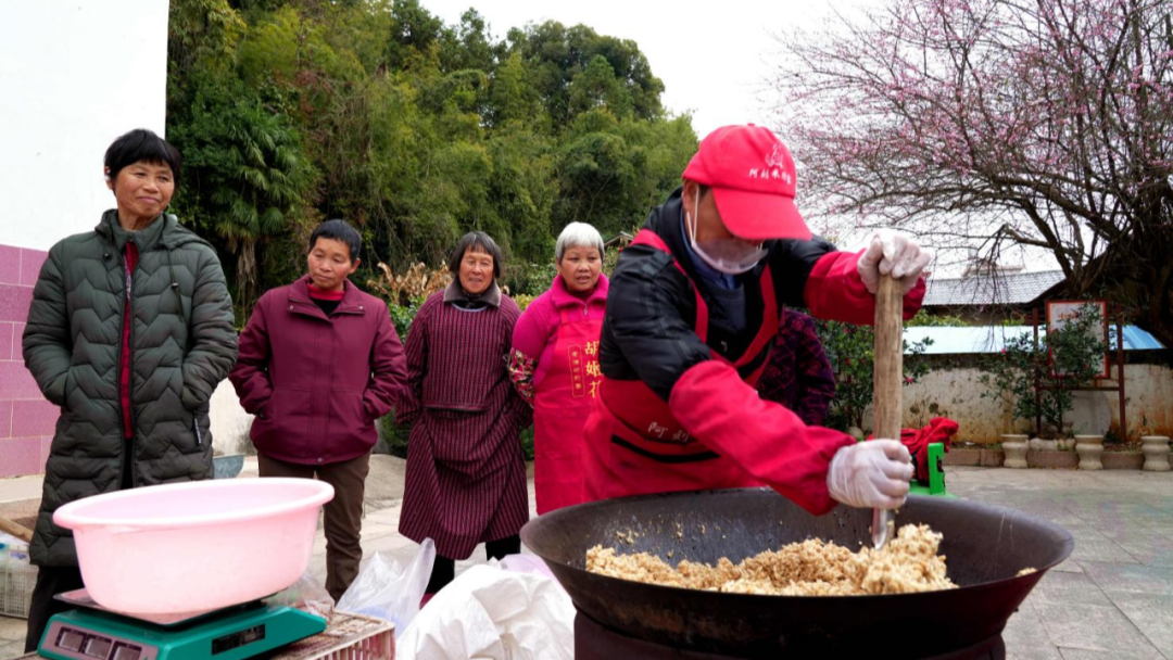 1月26日,記者走進洪山鎮(zhèn)尚徑村,濃郁的甜香便撲面而來。年關(guān)將至,“米臘嘗”制作手藝人劉榮芬迎來了一年中最忙碌的時刻。一口鐵鍋、一方木模,是他堅守四十余載的老陣地,而對準(zhǔn)灶臺的直播鏡頭,則為這份老味道打開了新窗口。直播間里,劉師傅的動作行云流水,提前炒香的大米、花生、芝麻按比例拌勻,轉(zhuǎn)身倒入熬至起絲的麥芽糖鍋中,快速翻攪讓每一粒食材都裹滿晶瑩糖汁,隨即盛入木質(zhì)模具,木推子鋪平、木滾筒壓實,待糖汁冷卻定型,利落切塊裝罐。熱氣騰騰的制作現(xiàn)場,甜香溢滿工坊,十里八鄉(xiāng)的村民慕名而來嘗鮮訂購,直播間里網(wǎng)友的點贊與評論也不斷刷屏,線上線下共品這份熱氣騰騰的客家年味。
