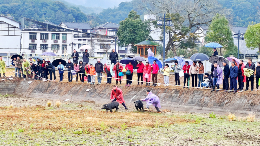 除了購物與非遺體驗,一系列趣味活動也吸引眾多游客參與。趣味捉兔區域,小朋友在家長陪同下開心捉兔,而在旁邊的“生態年豬”抓捕現場,氣氛更是達到了高潮!只見鎮村干部分成6個組,卷起褲腿、赤腳踩進泥濘的田園里,對著頭頭肥碩的土豬展開“圍追堵截”?,F場泥點飛濺,干部化身“捕手”,與靈活的土豬上演“速度與激情”,引得圍觀群眾捧腹大笑、加油助威。這一抓,抓的是土豬,更是農戶一年的好收成和沉甸甸的“年味”!